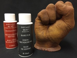 Ci dessus, l’objet de gauche est en fer, et le produit a oxydé le métal, le poing est en plâtre.